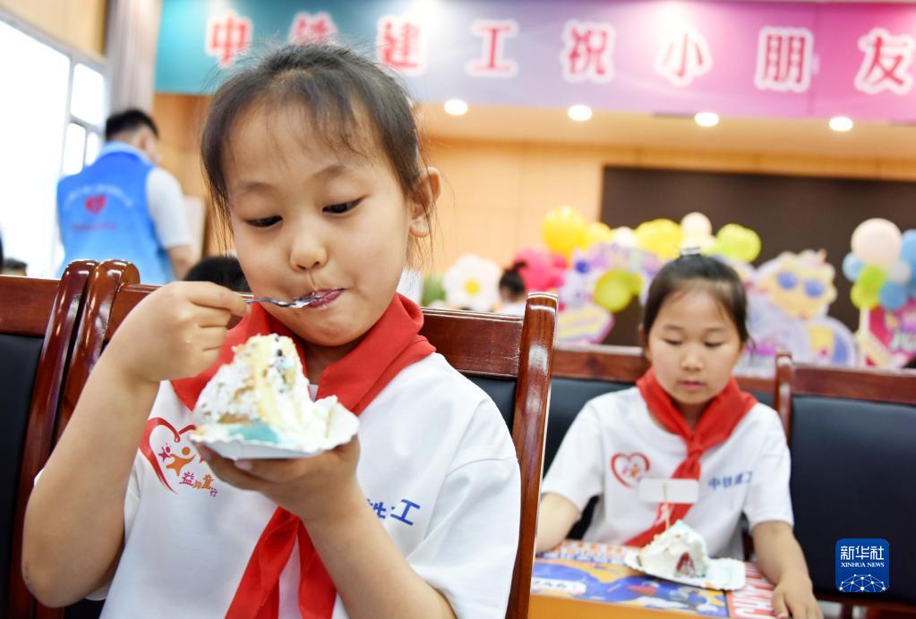 5月28日,小朋友在聯(lián)歡活動(dòng)上品嘗蛋糕。