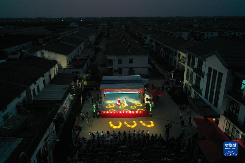 5月28日,江蘇省文化和旅游廳送戲下鄉活動(dòng)在淮安市漣水縣保灘街道肖渡村舉行(無(wú)人機照片)。