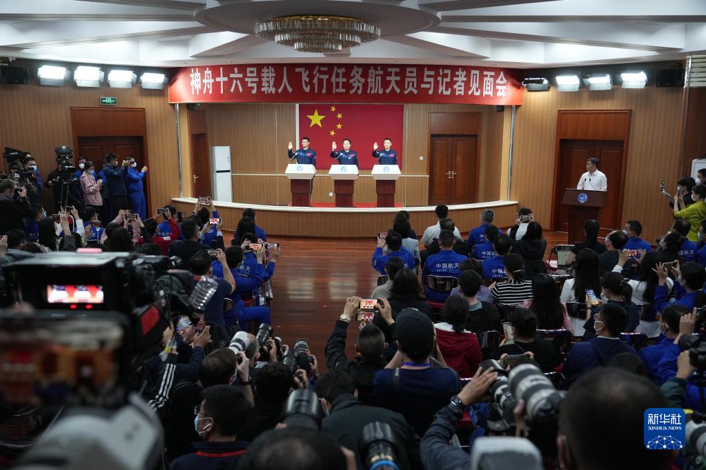 5月29日,神舟十六號航天員乘組與中外媒體記者集體見(jiàn)面會(huì )在酒泉衛星發(fā)射中心問(wèn)天閣舉行。這是指令長(cháng)景海鵬(中)、航天飛行工程師朱楊柱(右)、載荷專(zhuān)家桂海潮揮手致意。
