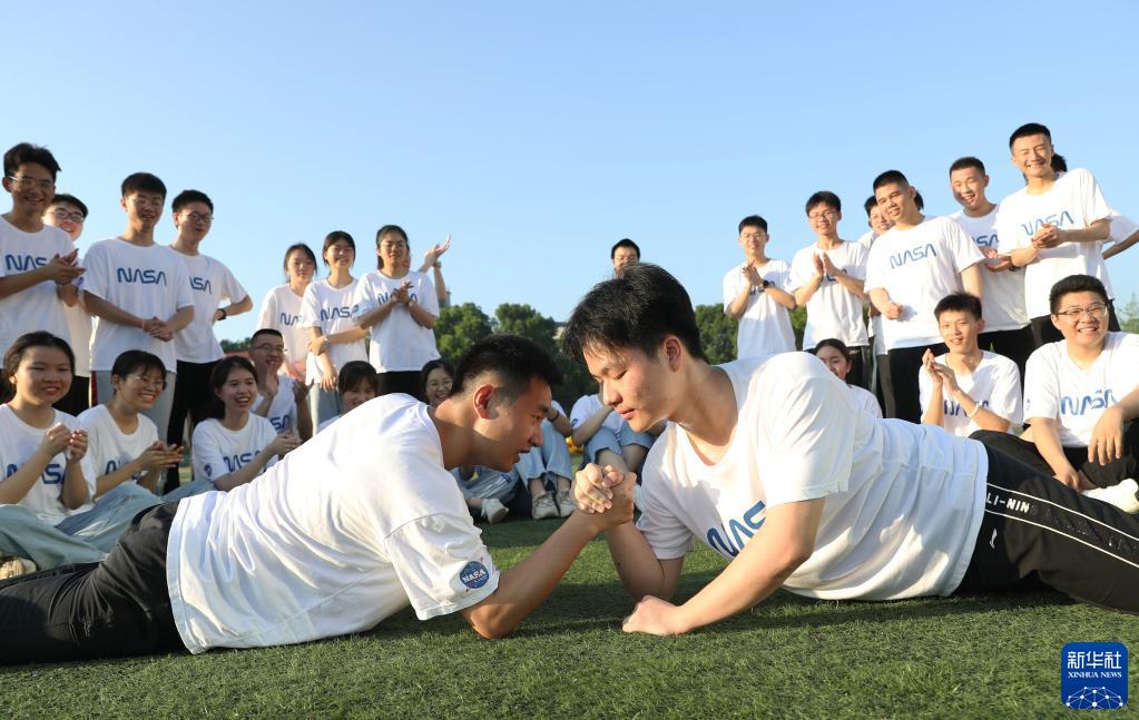 5月29日,在湖南省衡陽(yáng)市衡陽(yáng)縣第一中學(xué)操場(chǎng),高三畢業(yè)班同學(xué)在晨練中比賽扳手腕。