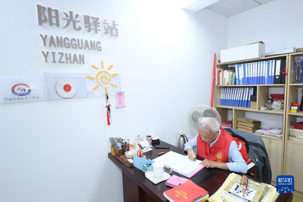 5月29日,在湖州市環(huán)渚街道玉堂橋社區,凌法林在陽(yáng)光驛站記錄活動(dòng)情況。