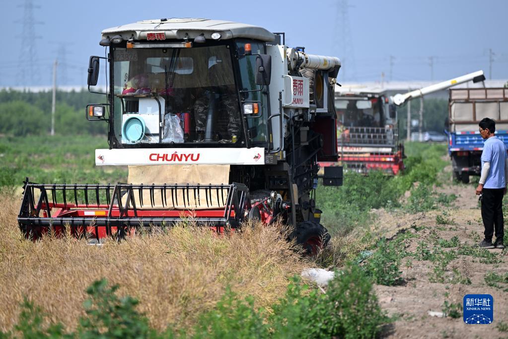 當日,天津市北辰區大張莊鎮田莊村的1100畝油菜田,開(kāi)始集中收割菜籽。聯(lián)合收割機將在三天內完成采收,為下一輪種植高粱留出時(shí)間。