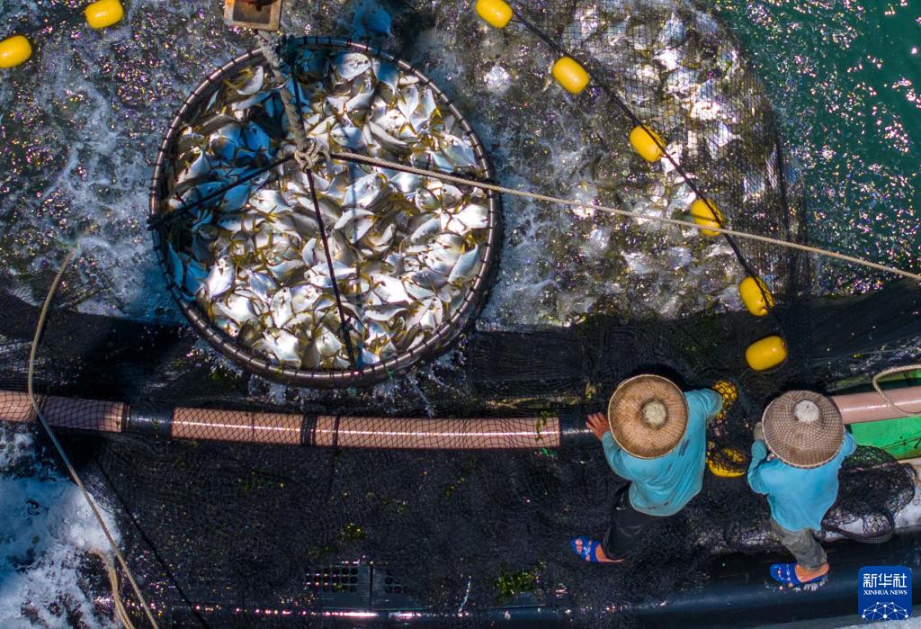在湛江徐聞西連鎮,漁業(yè)工人從深海網(wǎng)箱中打撈金鯧魚(yú)(5月27日攝,無(wú)人機照片)。廣東省湛江市是全國最大的金鯧魚(yú)養殖基地之一,被譽(yù)為“中國金鯧魚(yú)之都”。