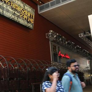 5月29日,人們經(jīng)過(guò)美國紐約曼哈頓的“國債鐘”?!皣鴤姟笔且粋€(gè)大型計數器,它實(shí)時(shí)更新美國的公共債務(wù)總額,并顯示出每個(gè)美國家庭所要負擔的數額。