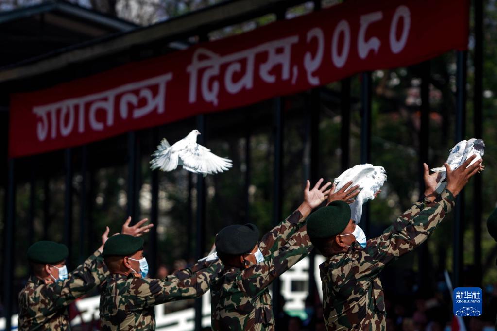 5月29日,軍人在尼泊爾加德滿(mǎn)都舉行的共和日慶?;顒?dòng)上放飛鴿子。