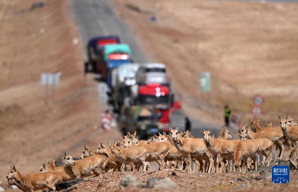 5月29日,在青??煽晌骼?,一群雌性待產(chǎn)藏羚羊通過(guò)青藏公路。