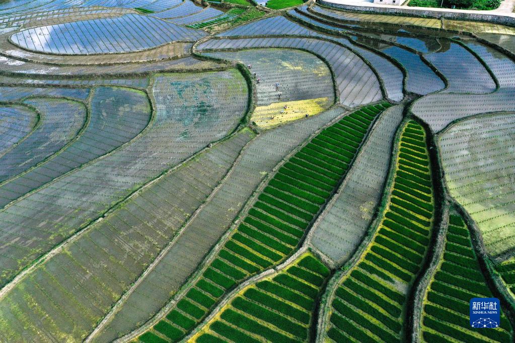 5月29日,村民在岑鞏縣水尾鎮新場(chǎng)村的雜交水稻制種基地移栽制種水稻秧苗(無(wú)人機照片)。