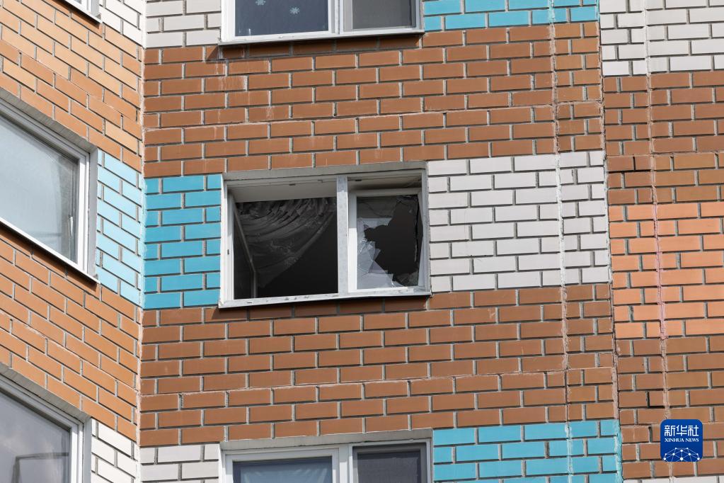 這是5月30日在俄羅斯首都莫斯科拍攝的受損樓房窗戶(hù)。