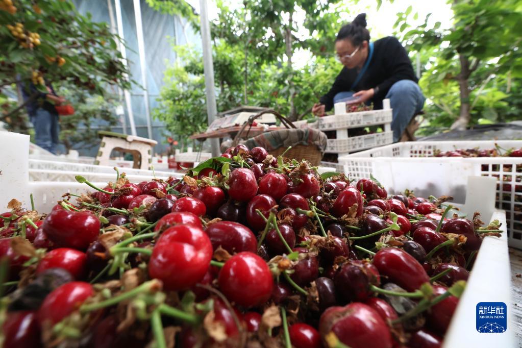 5月30日,在石家莊市欒城區西宮村大棚櫻桃種植園,工作人員在分揀打包櫻桃。