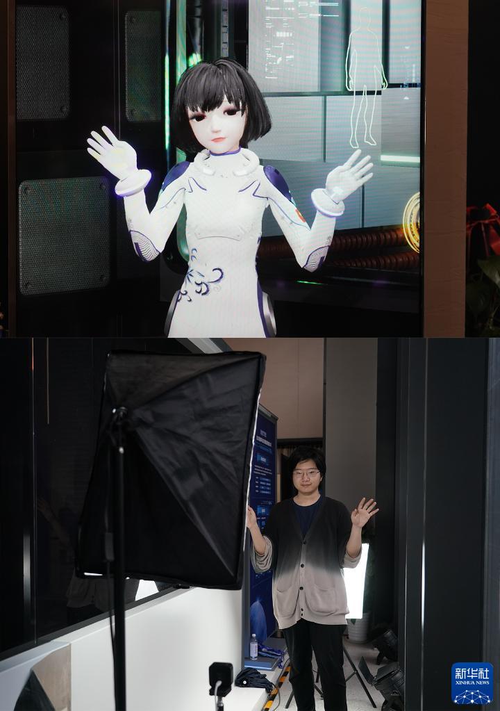 5月30日,工作人員在科幻產(chǎn)業(yè)新技術(shù)新產(chǎn)品展現場(chǎng)展示虛擬數字人(拼版照片)。
