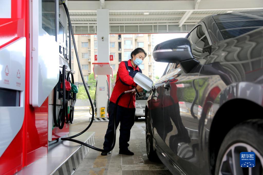 5月30日,在江蘇省連云港市連云區一加油站,工作人員給汽車(chē)加油。