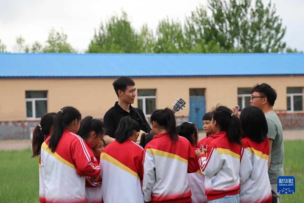 5月29日,在安達市任民鎮中心小學(xué),音樂(lè )老師在學(xué)校草坪上與音樂(lè )班的孩子們練習唱歌。