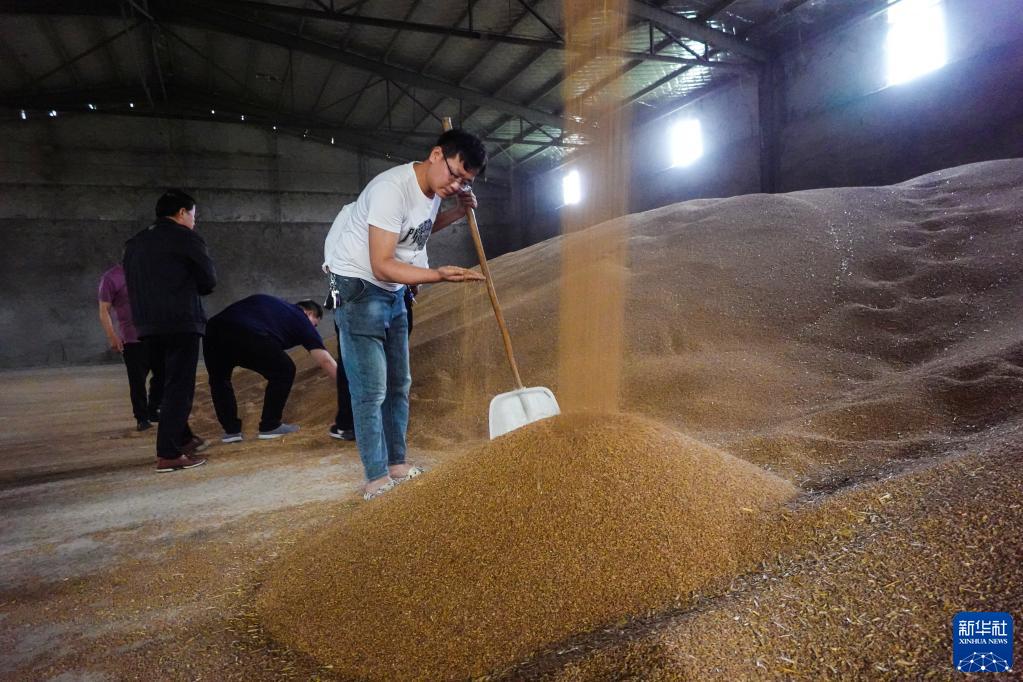 5月30日,河南省正陽(yáng)縣大林鎮一家糧業(yè)公司員工對濕小麥進(jìn)行烘干處理。