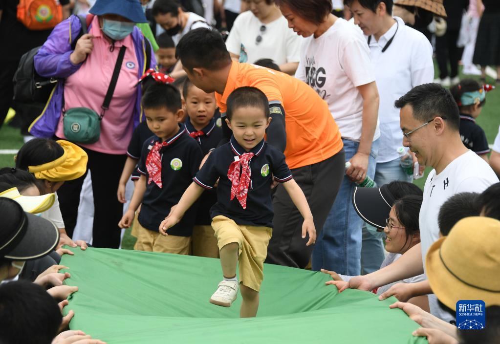 5月31日,在北京大學(xué)醫學(xué)部幼兒園2023年慶“六一”親子運動(dòng)會(huì )現場(chǎng),小朋友和家長(cháng)參與親子游戲。