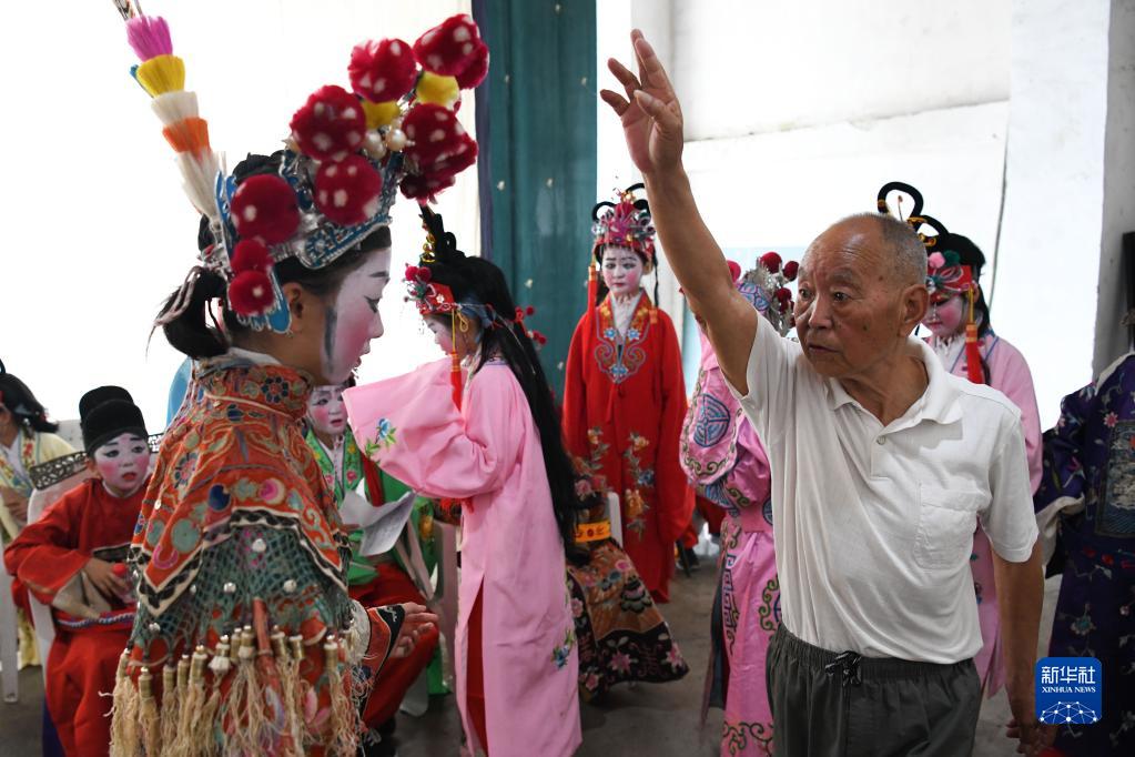 5月30日,民間老藝人邵千峰(前右)在徽劇展演前指導一名伏嶺鎮中心小學(xué)“徽劇童子班”的學(xué)生。