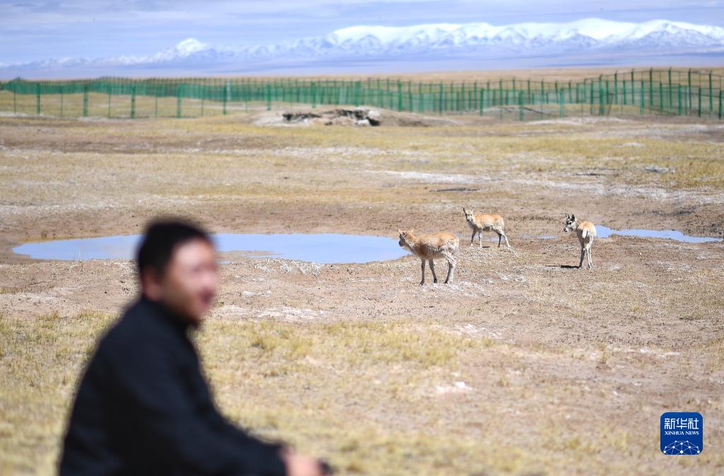 在可可西里國家級自然保護區索南達杰保護站,藏羚羊在野生動(dòng)物救助中心活動(dòng)(5月30日攝)。