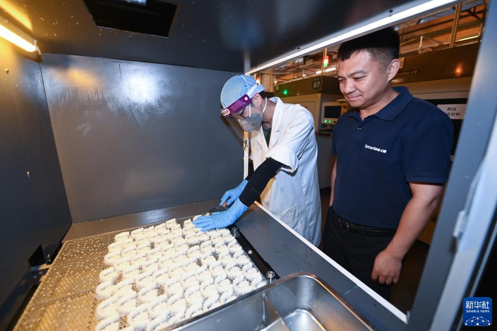 5月31日,浙江正雅齒科股份有限公司董事長(cháng)姚峻峰(右)在位于嘉興南湖高新區的公司車(chē)間內查看生產(chǎn)線(xiàn)上的個(gè)性化定制式隱形正畸矯治器。姚峻峰是畢業(yè)于英國赫爾大學(xué)的工商管理碩士,回國后創(chuàng )辦了正雅齒科公司。