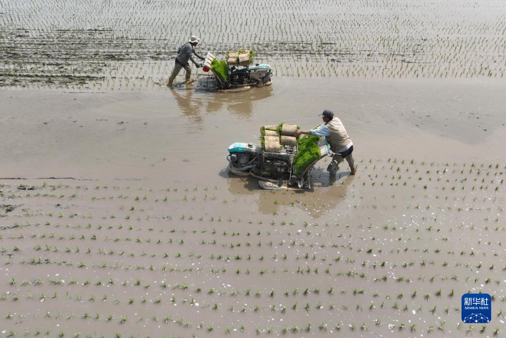 5月31日,河北省唐山市豐南區夏新莊村的農民在田間進(jìn)行插秧作業(yè)(無(wú)人機照片)。