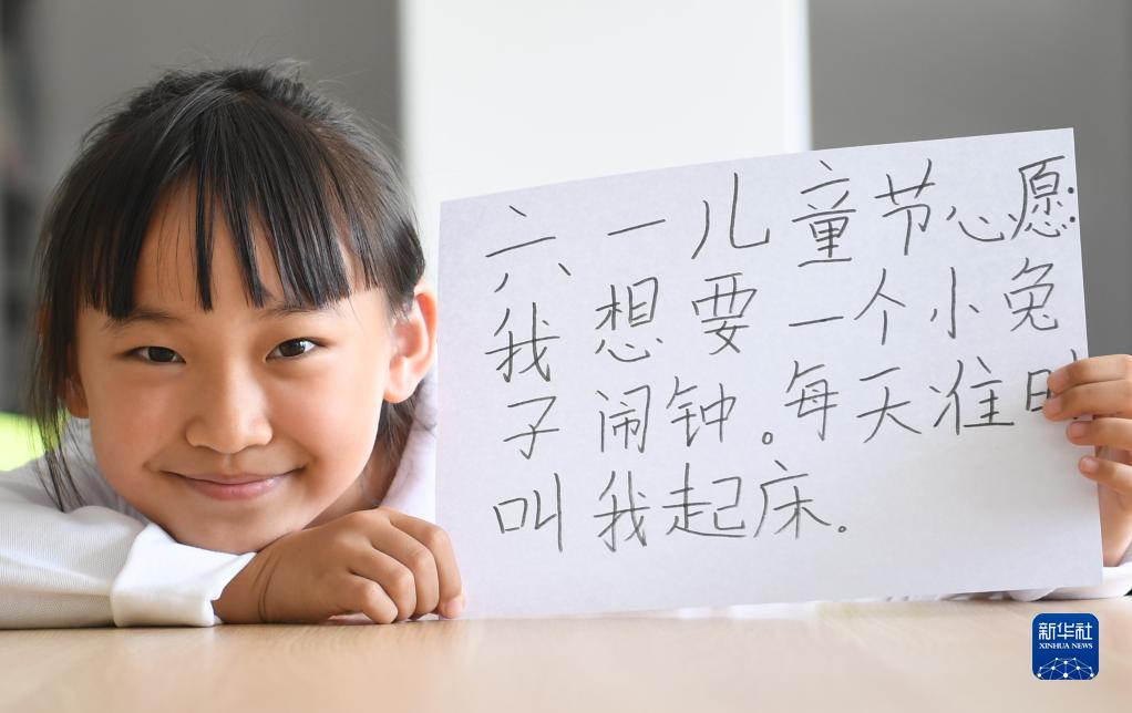 河北雄安新區容東片區容和悅容小學(xué)三年級四班陳思穎展示“六一”微心愿(5月24日攝)。
