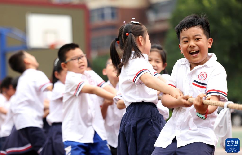 5月31日,在合肥市和平小學(xué)第四小學(xué)舉辦的“傳統游戲迎六一”活動(dòng)中,孩子們參加拔河比賽。