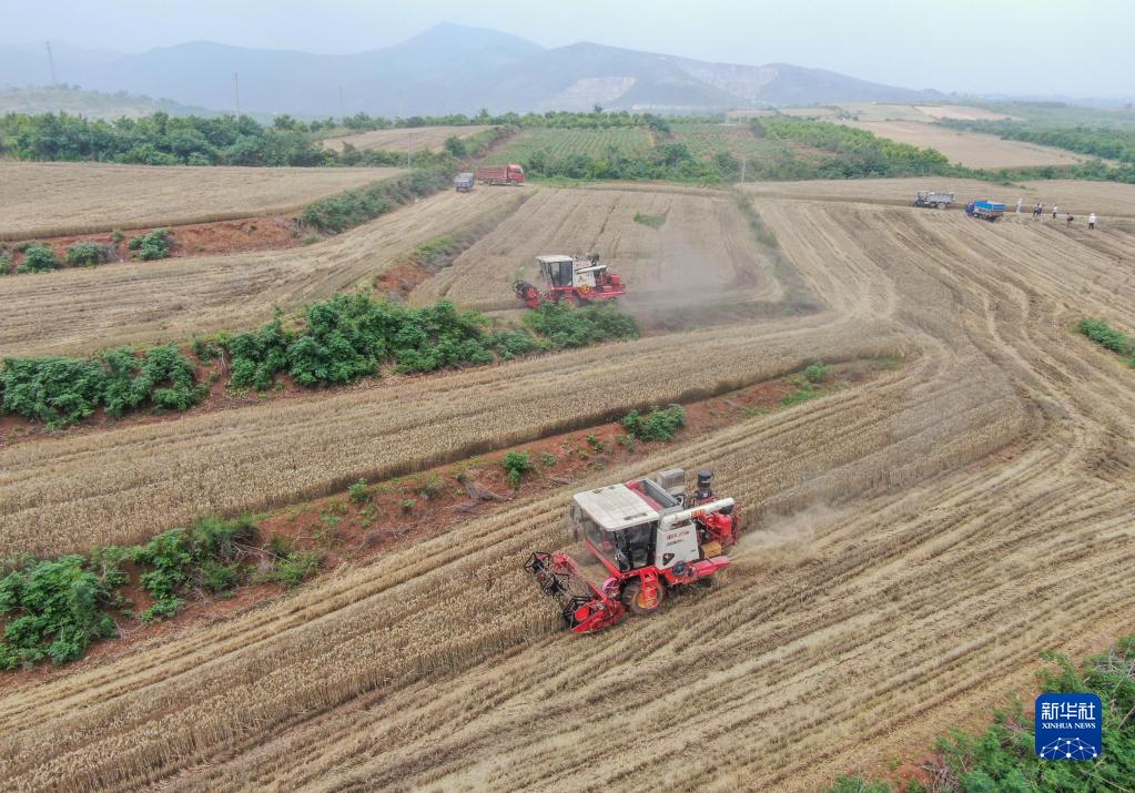 5月31日,在河南省洛陽(yáng)市偃師區大口鎮鐵村的麥田里,聯(lián)合收割機在收割小麥。