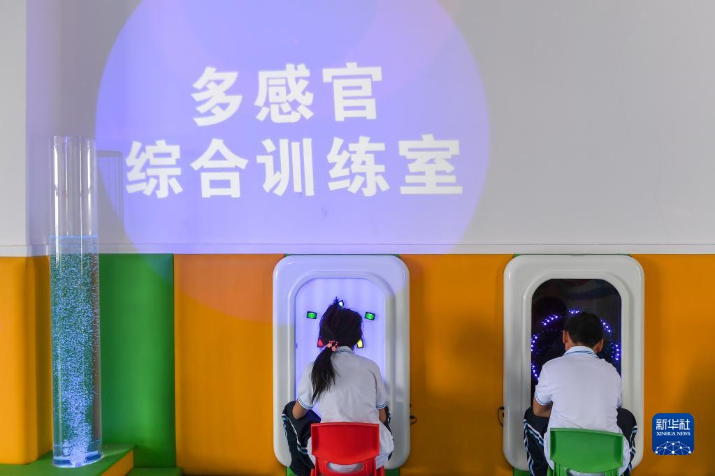 5月31日,在四平市聾啞學(xué)校,兩位殘障學(xué)生使用多感官訓練教具。