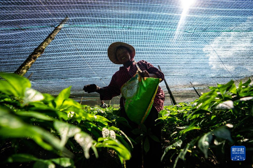 5月31日,在文山州西疇縣蓮花塘鄉一個(gè)三七種植基地,農民在給三七施肥。