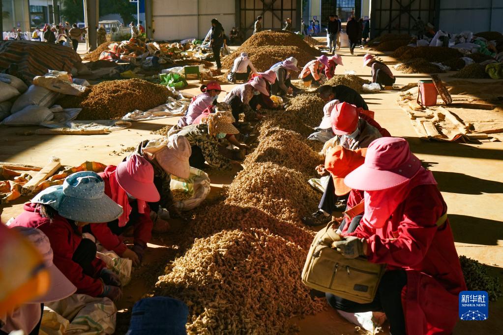 2022年11月27日,在文山三七交易市場(chǎng),趕三七早市的群眾在分揀三七。