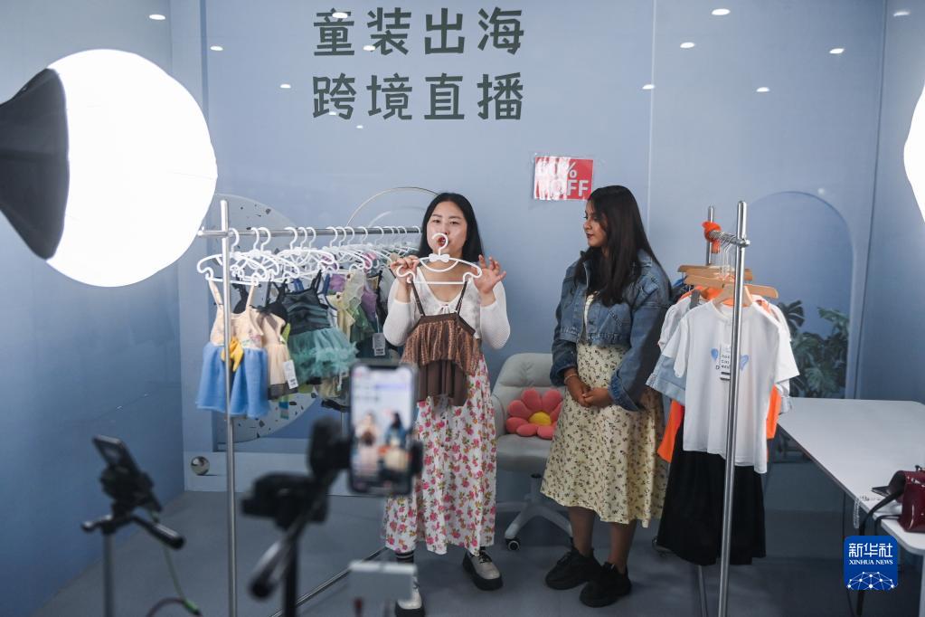 6月1日,童裝廠(chǎng)商在童裝時(shí)尚周上進(jìn)行跨境直播銷(xiāo)售。