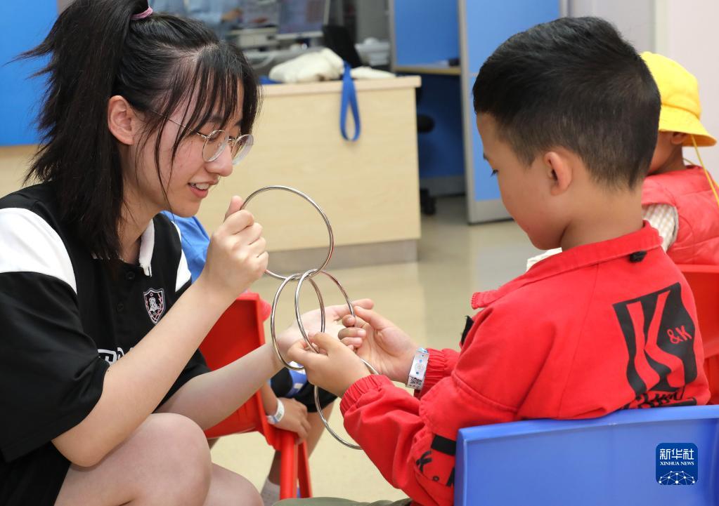 6月1日,在復旦大學(xué)附屬兒科醫院第八病區,上海市馬戲學(xué)校的學(xué)生志愿者與住院患兒互動(dòng)表演魔術(shù)。