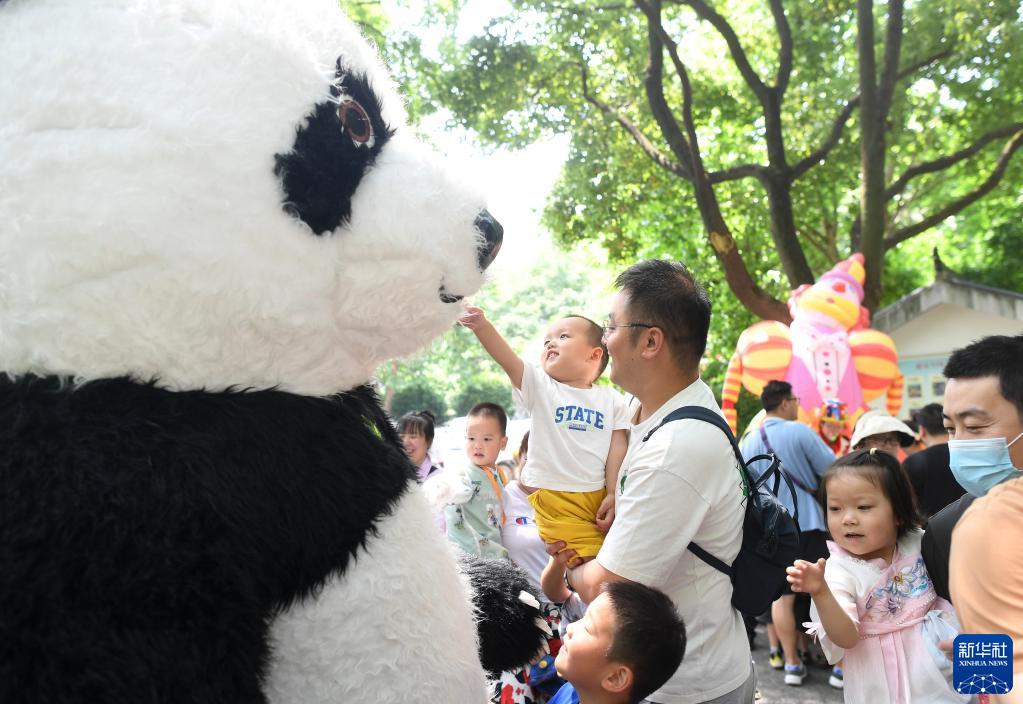 6月1日,在武漢市江岸區堤角公園,孩子們和熊貓人偶拍照互動(dòng)。