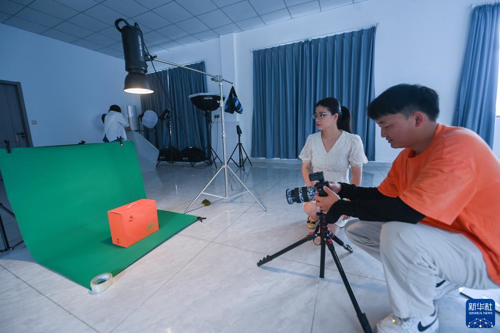 6月1日,洪潔(后)在位于湖州市織里鎮的蟹臨門(mén)農業(yè)科技開(kāi)發(fā)有限公司內和工作人員一起拍攝產(chǎn)品宣傳照片。洪潔畢業(yè)于美國紐約州立大學(xué),通過(guò)招商引資的形式,來(lái)到浙江省湖州市織里鎮,投資湖州蟹臨門(mén)農業(yè)科技開(kāi)發(fā)有限公司。