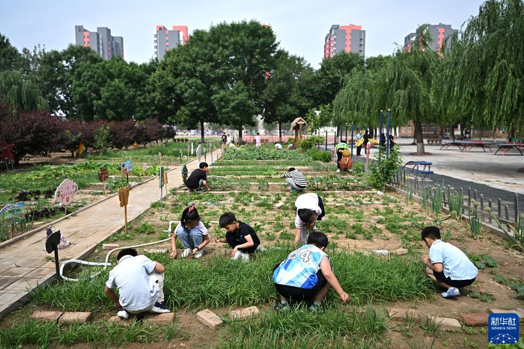 5月31日,中關(guān)村第三小學(xué)雄安校區的學(xué)生在學(xué)校設立的“雄安農場(chǎng)”里手工除草?!靶郯厕r場(chǎng)”里每個(gè)班級都有自己的一塊土地,學(xué)校通過(guò)農場(chǎng)勞動(dòng)課,讓同學(xué)們從科學(xué)走向生活,從知識走向能力。