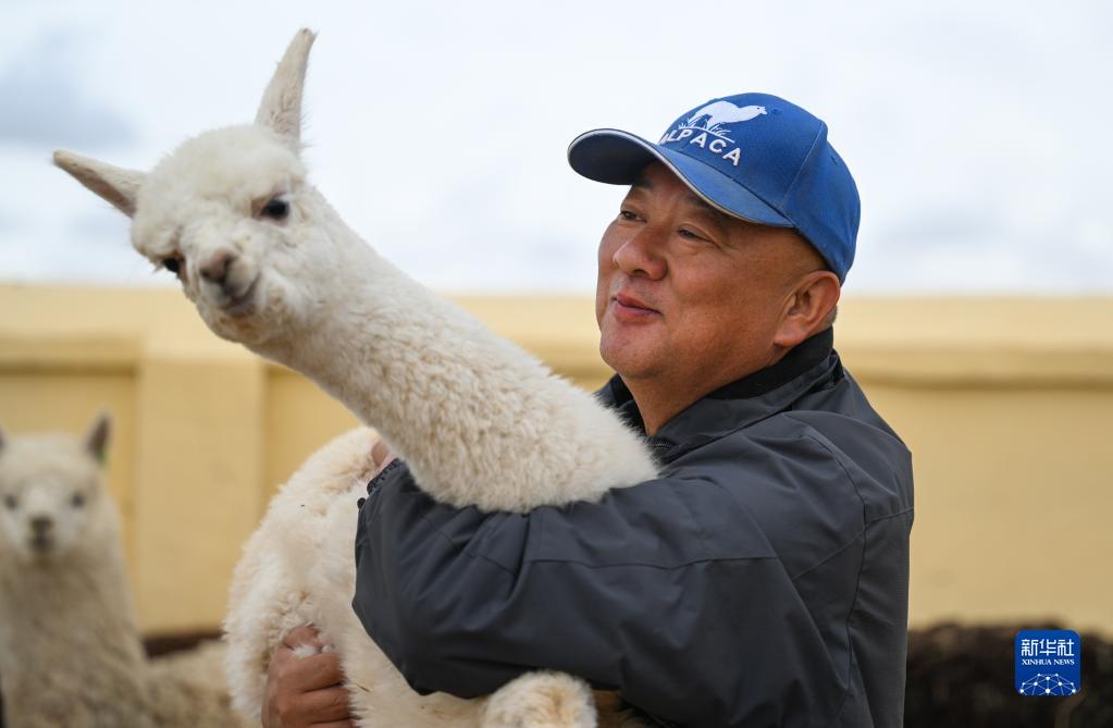 6月1日,巴彥杭蓋嘎查羊駝養殖基地的工作人員在觀(guān)察羊駝的飼養情況。