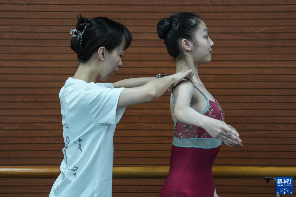 5月30日,遼寧芭蕾舞團附屬芭蕾舞蹈學(xué)校的老師在為五年級的學(xué)生上芭蕾課。