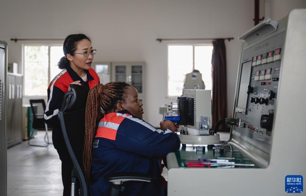 5月23日,在肯尼亞內羅畢,陳玲(左)指導學(xué)員朱迪思檢測繼電器。