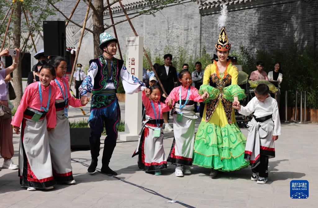 6月1日,來(lái)自玉樹(shù)州的孩子們在北京蒙藏學(xué)校舊址和中央民族歌舞團的演員互動(dòng)。