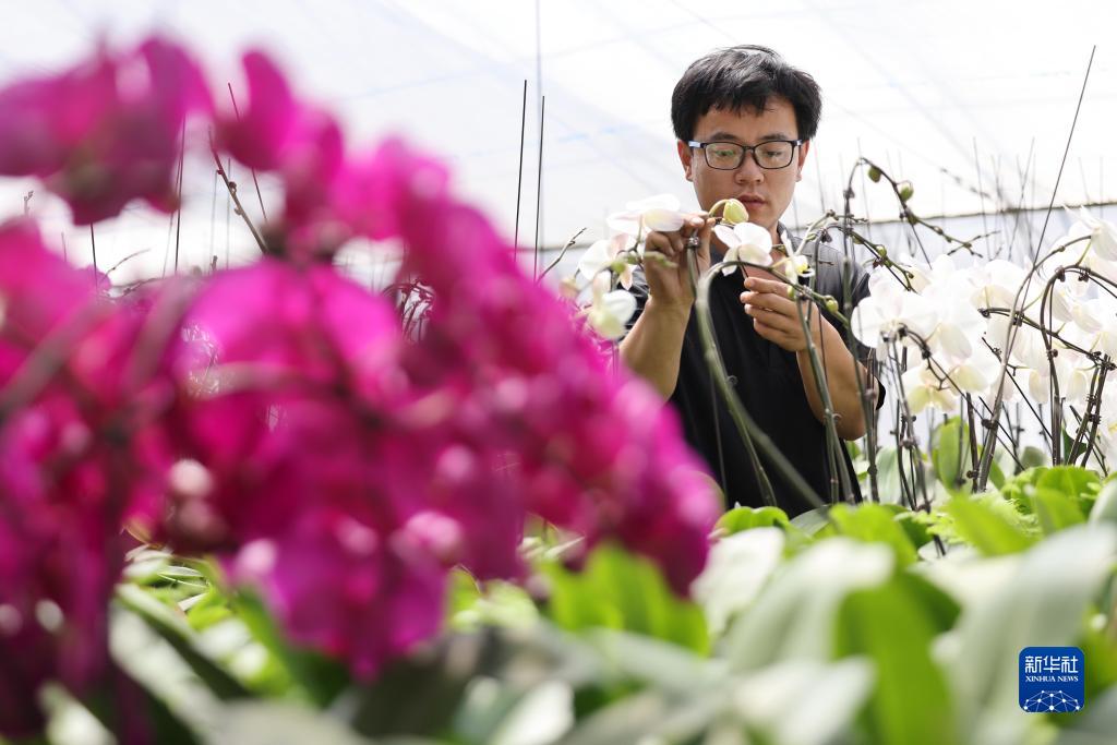 6月1日,在石家莊藁城區石家莊品夢(mèng)花卉種植有限公司溫室大棚,工作人員在管護花卉。