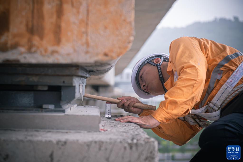 6月1日,寧波工務(wù)段金甬鐵路提前介入組的工人對新昌江特大橋橋墩進(jìn)行檢測。