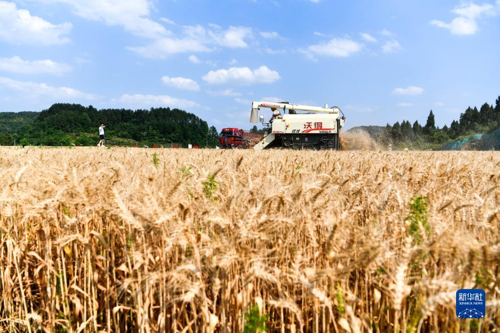 5月31日,在貴州省貴陽(yáng)市開(kāi)陽(yáng)縣宅吉鄉堰塘村,農民駕駛收割機在高標準農田里收割小麥。