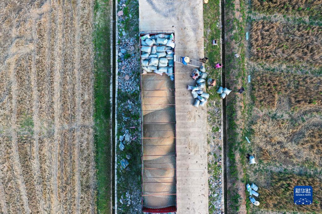 5月31日,在貴州省貴陽(yáng)市開(kāi)陽(yáng)縣宅吉鄉堰塘村,農民將收割的小麥裝車(chē)(無(wú)人機照片)。