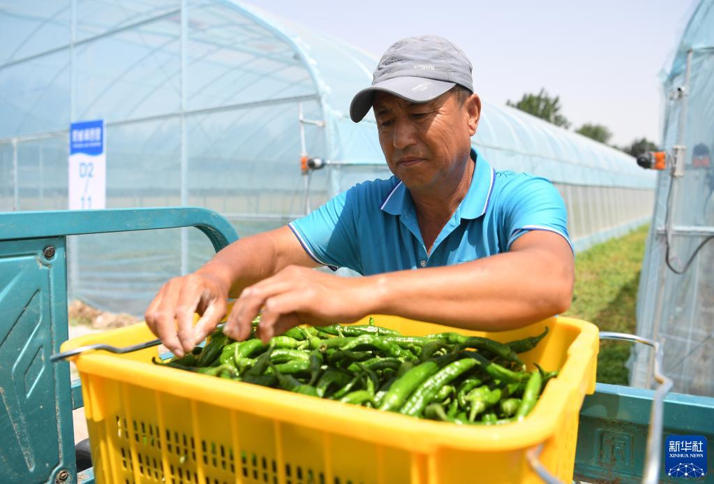6月1日,河北雄安新區安新縣陽(yáng)雀湖西里現代農業(yè)產(chǎn)業(yè)園區工人在整理采摘的辣椒。