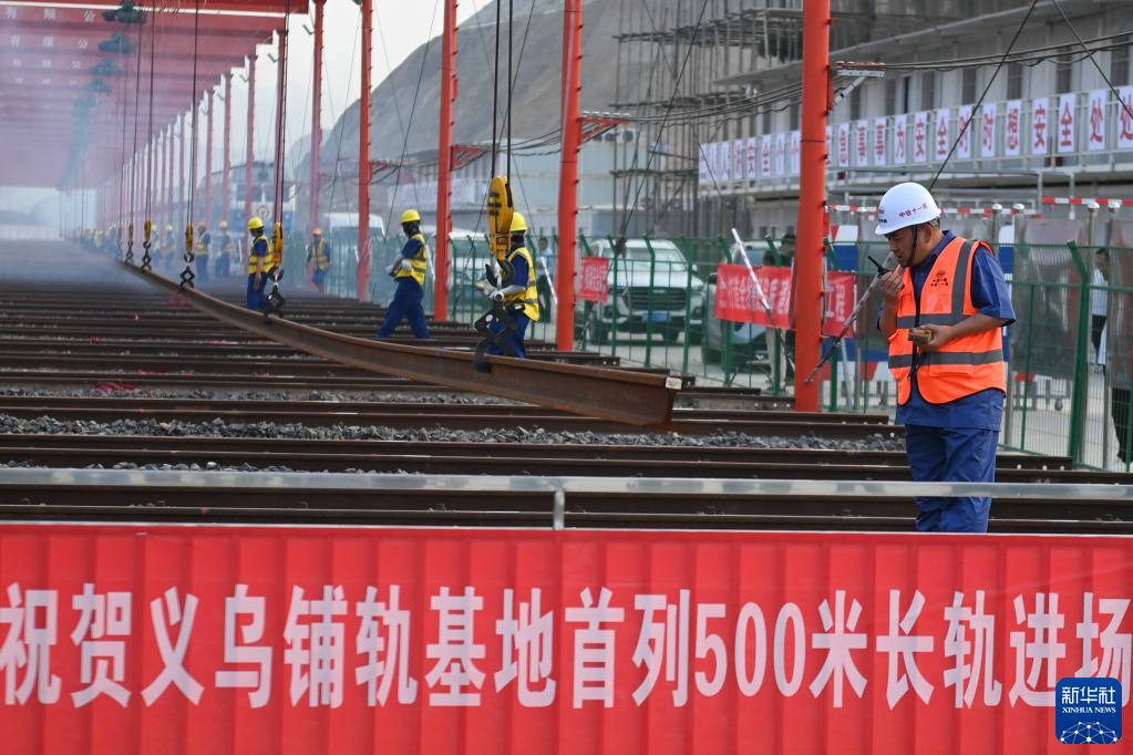 6月1日,中鐵十一局工程技術(shù)人員在杭溫鐵路義烏鋪軌基地堆碼500米長(cháng)鋼軌。