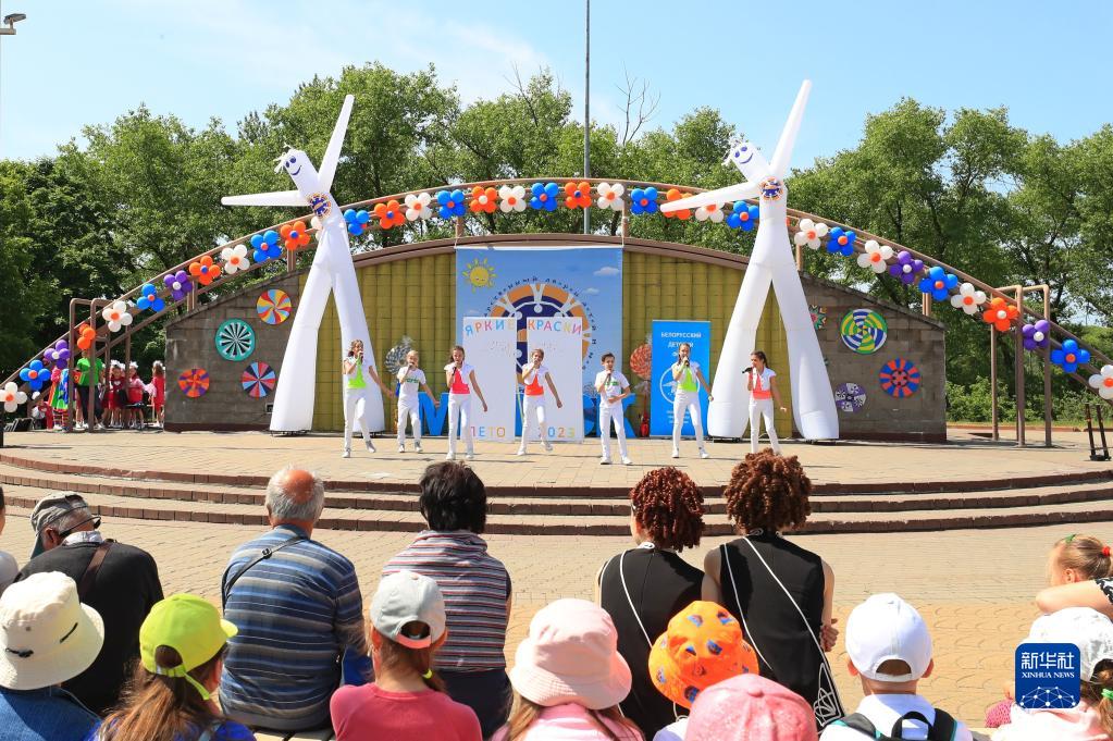 6月1日,孩子們在白俄羅斯首都明斯克表演節目,慶?!傲弧眹H兒童節。