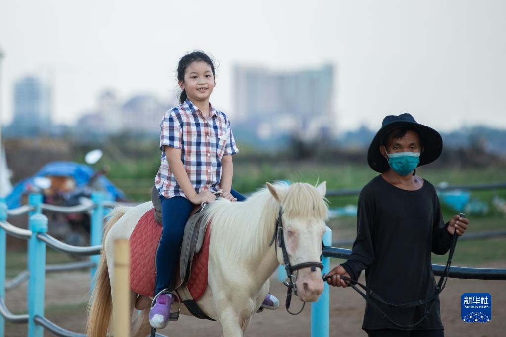 6月1日,一名兒童在老撾首都萬(wàn)象湄公河邊學(xué)騎馬,慶?!傲弧眹H兒童節。