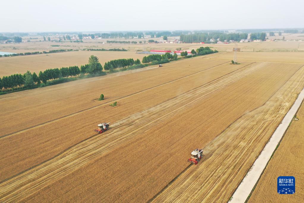 6月1日,在河南省駐馬店市上蔡縣邵店鎮后楊村,收割機在搶收小麥(無(wú)人機照片)。新華社記者 張浩然 攝