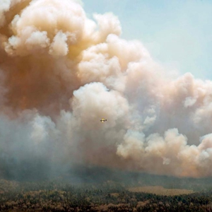 5月31日,在加拿大新斯科舍省謝爾本縣巴靈頓湖附近,一架飛機飛過(guò)野火上空。