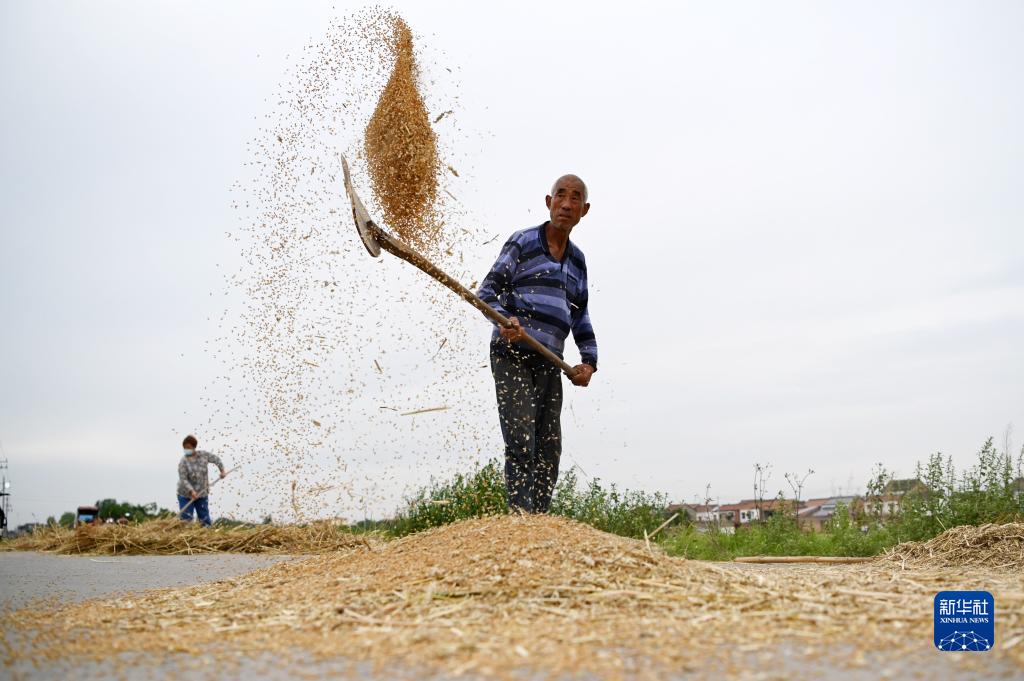 6月2日,在河南省沁陽(yáng)市王召鄉張莊村,農民晾曬剛剛收獲的小麥。