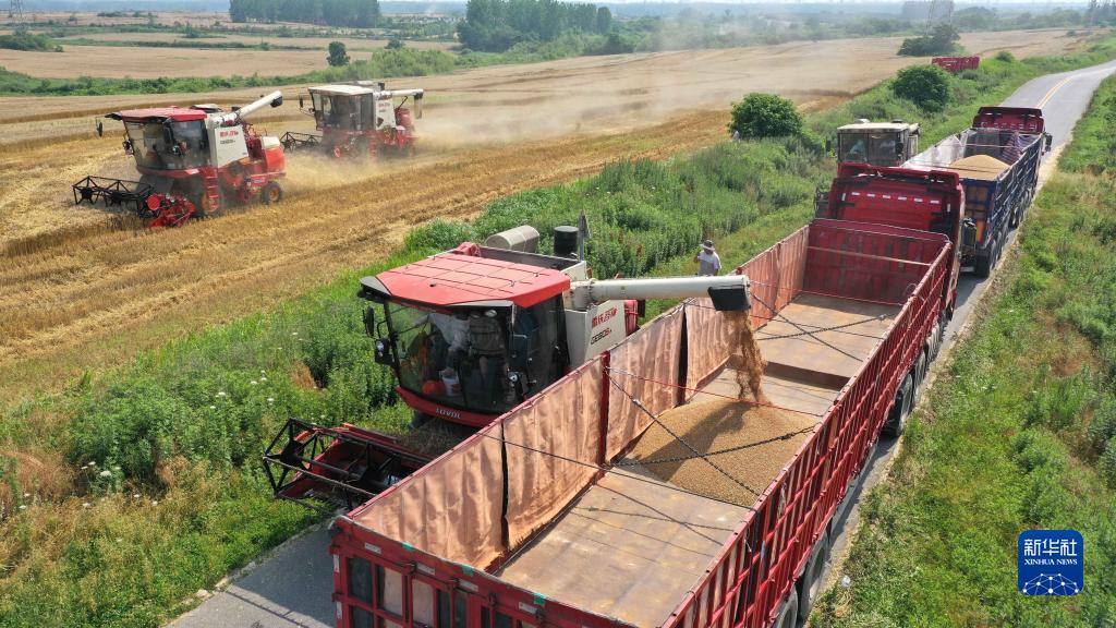 6月2日,在合肥市蜀山區小廟鎮段沖村,收割機將小麥裝車(chē)(無(wú)人機照片)。