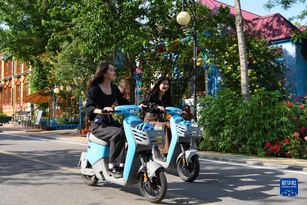 在新疆伊犁哈薩克自治州伊寧市六星街,游客騎著(zhù)電動(dòng)車(chē)游覽(5月19日攝)。?